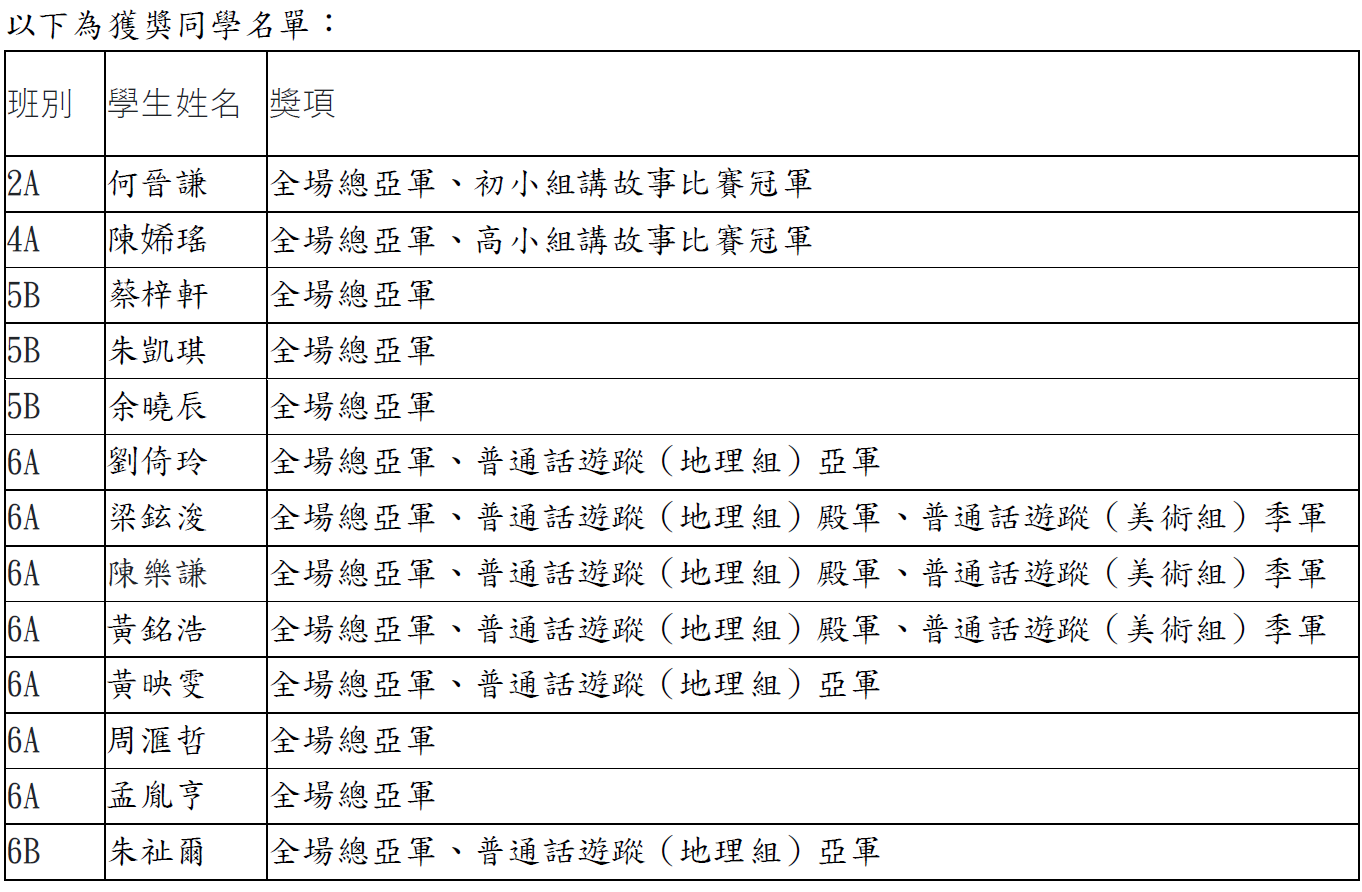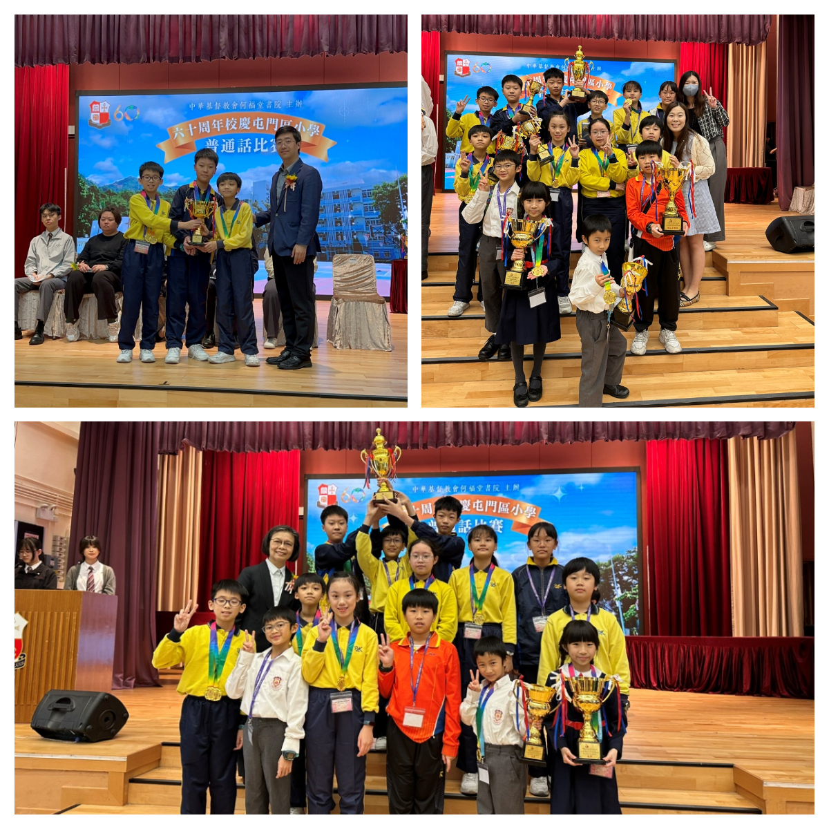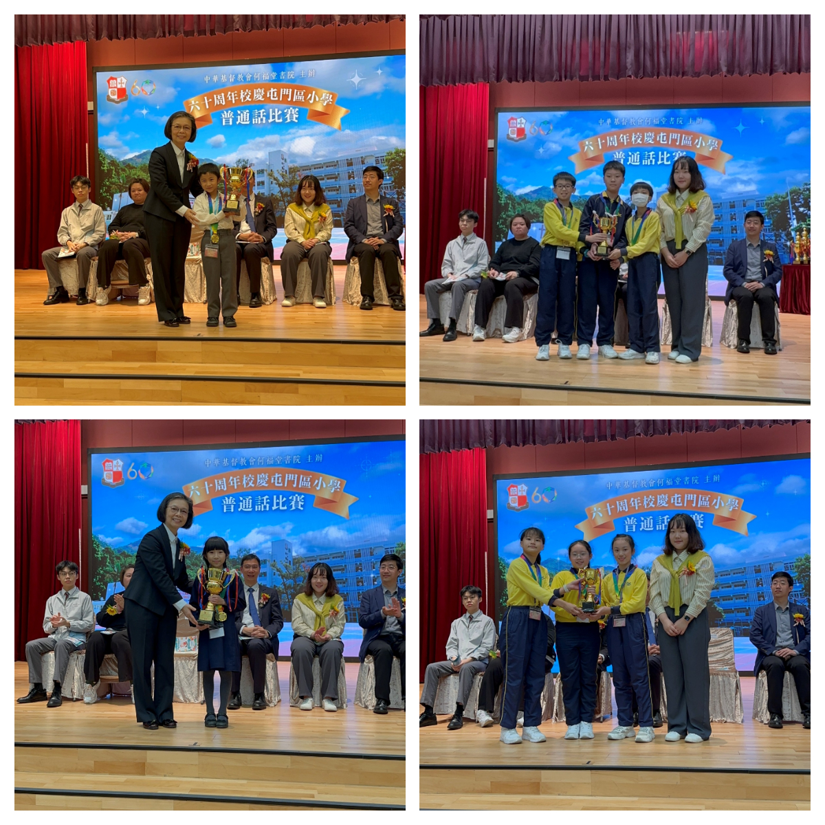 本校同學早前參與由何福堂中學舉辦的「第十六屆屯門區小學普通話比賽」,獲得多個傑出獎項,其中4A班陳㛓瑤同學連續三年在講故事項目奪取冠軍,本校更在參與的十六所小學中再次蟬聯全場總亞軍!