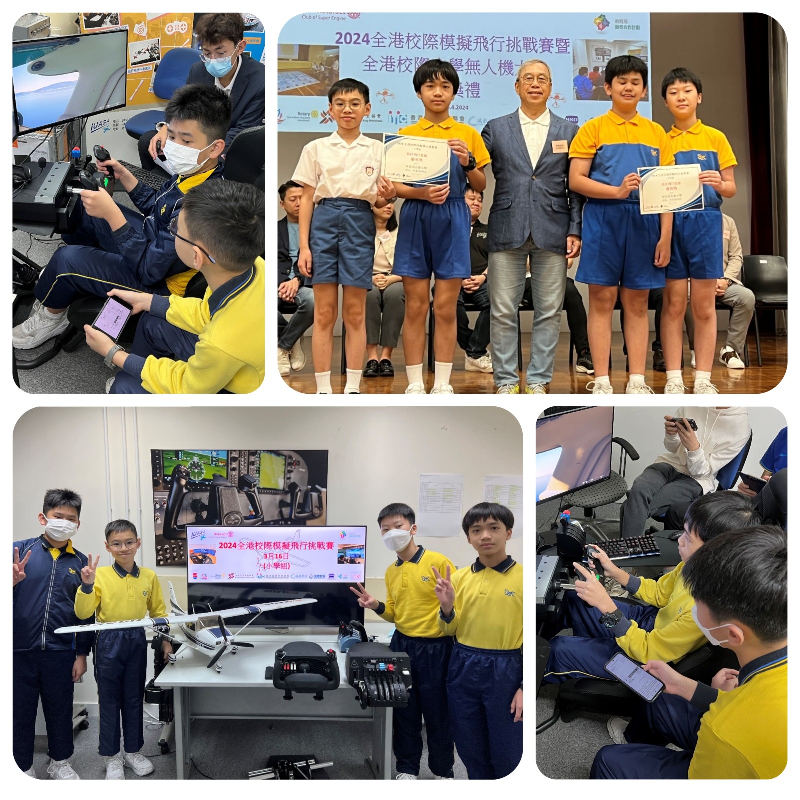 本校6A班黃銘浩同學、盧柏熹同學、高顥弘同學及6C何子朗同學代表本校參加「超級引擎扶青社」及「國際專業無人機學會」主辦的全港校際模擬飛行挑戰賽。經過近半年的練習,本校學生於比賽中榮獲「最佳飛行時間」優異獎及「最佳飛行技術」優異獎,恭喜以上同學。
