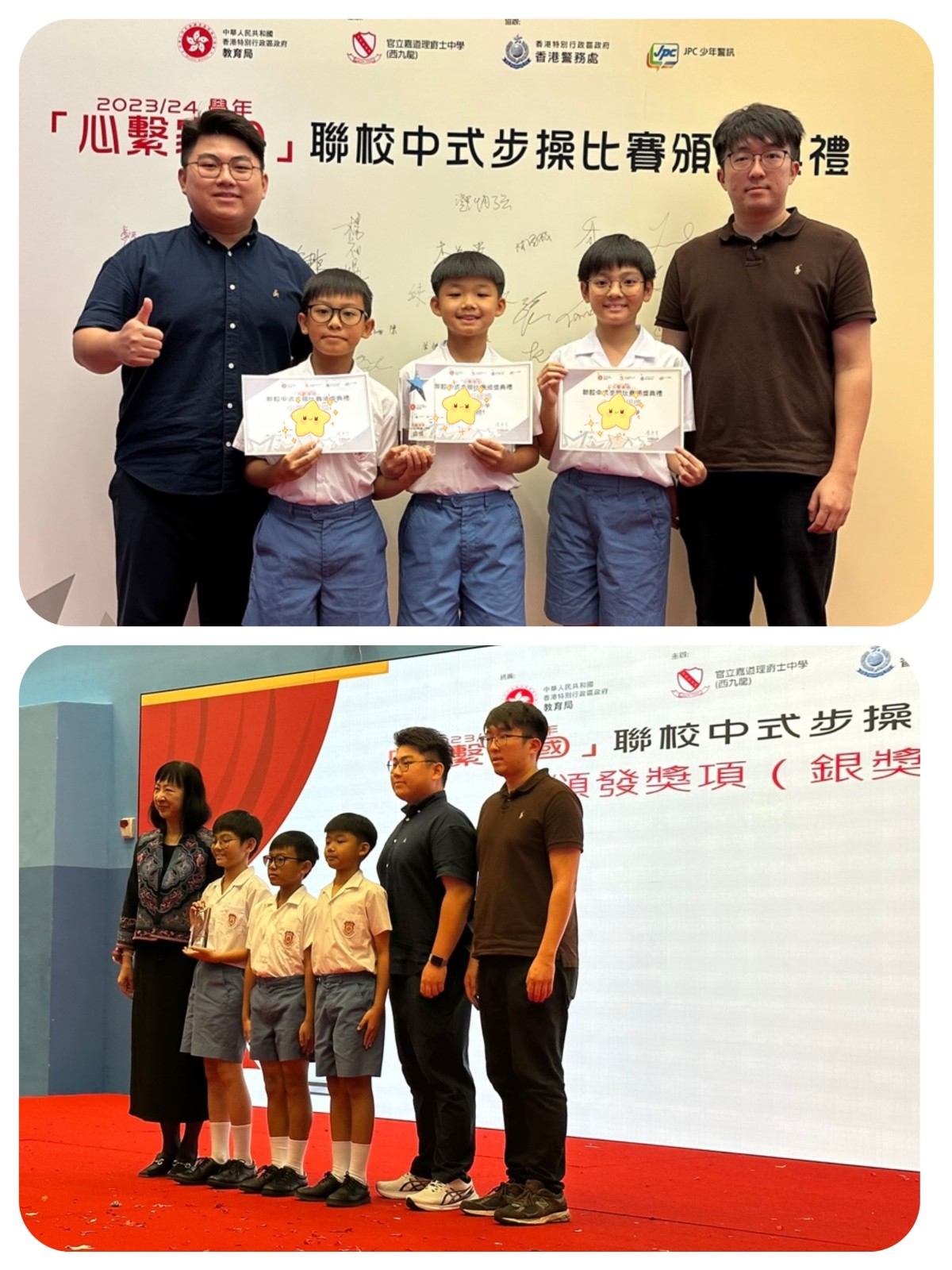 本校早前參加了由「聯校中式步操比賽及頒獎典禮」,比賽旨在鼓勵中小學生透過認識中式步操和升國旗儀式的步驟及禮儀,培養學生國民身份認同,推動國民教育,以及培育學生成為守紀律、尊重他人及具國家觀念的新一代,讓學生能全方位認識國情。是次比賽中,本校升旗隊隊員表現出色,參賽隊員包括郭峻熙、王天照、梁兆天及周博恒,隊伍榮獲小學組銀獎。