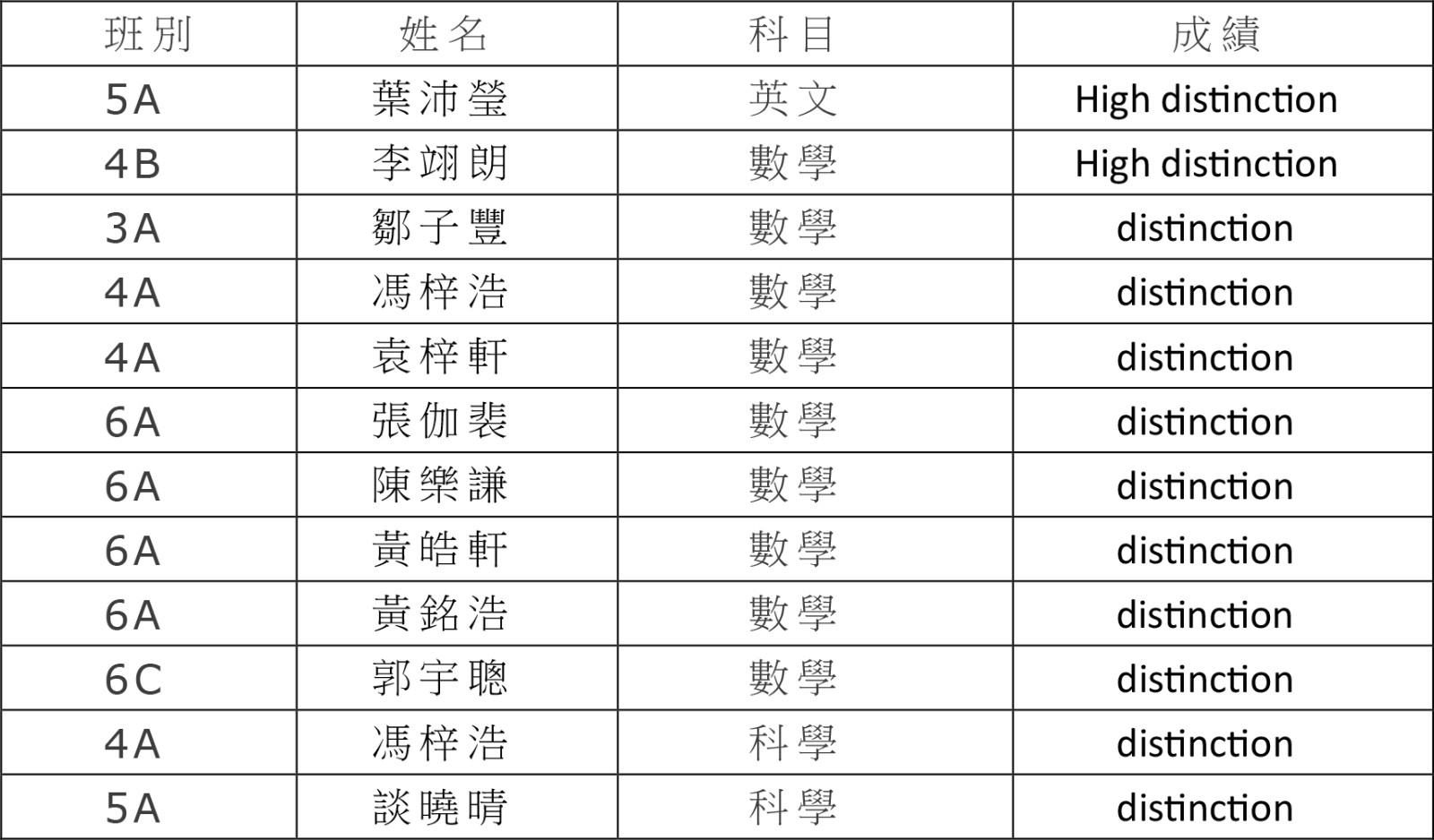 國際聯校學科評估及比賽是一項國際性的評估,旨在表彰和獎勵學術卓越的高潛力學生,每科成績最好的1% 參賽者更能獲得高級榮譽(High distinction)證書。恭喜各位獲得優異成績的同學!