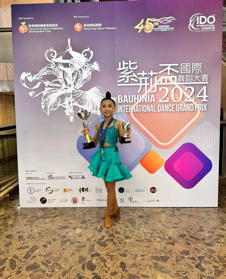 本校5D班何悅同同學於暑假期間參加了《紫荊盃舞蹈大賽》,於本地賽中幼童及兒童組(公開舞獨舞)中取得銅獎及最佳表演獎,並獲邀請參與國際賽。何同學於國際賽中表演出色,於眾多的國際隊伍中脫穎而出,勇奪金獎及最佳女演員獎。
