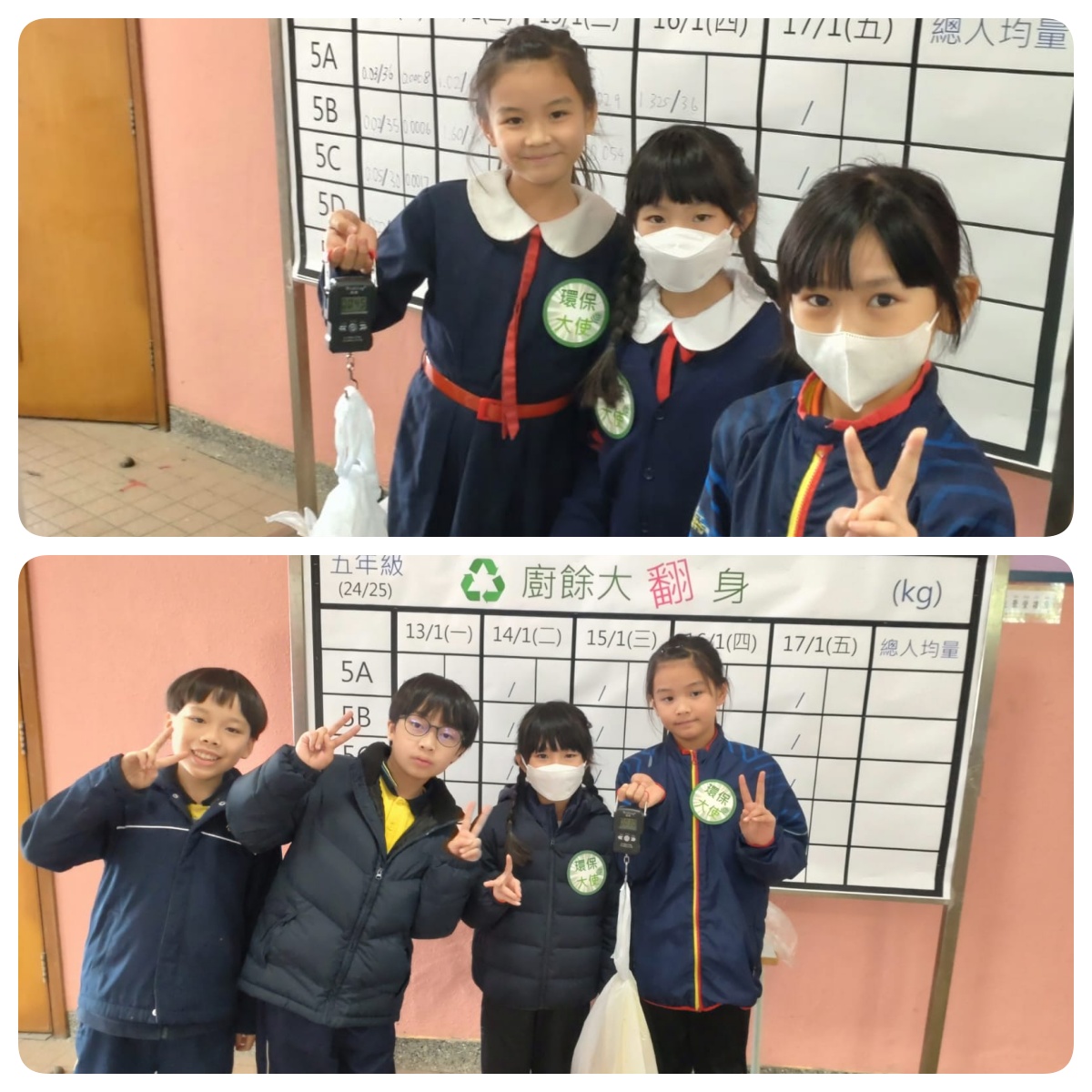 「廚餘大翻身」活動:這是全校舉行的校本活動,以比賽型式按級進行,2024年12月五、六年級已完成該活動,獲一周平均最少廚餘班別分別是5D班及6A班,一至四年級稍後將進行該活動。回收的廚餘會透過廚餘機製成肥料,或放環保署廚餘回收箱。
