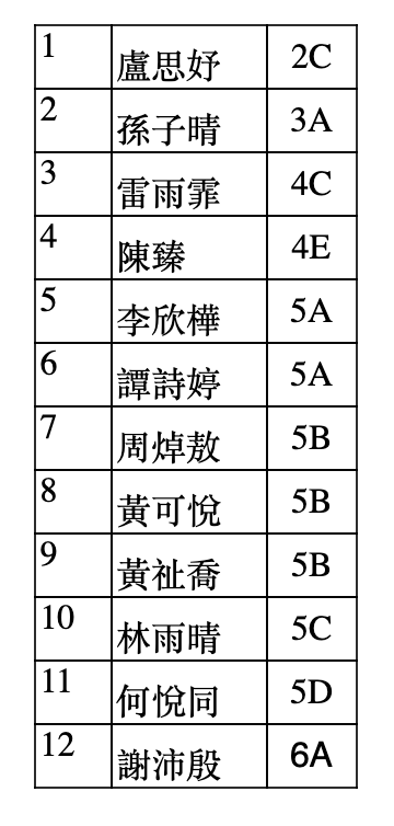 本校拉丁舞蹈隊較早前參加了由中國體育舞蹈總會舉辦的第二十一屆香港校際體育舞蹈(團體舞)錦標賽,奪得冠軍,恭喜各位同學。以下為拉丁舞隊(群舞)成員名單: