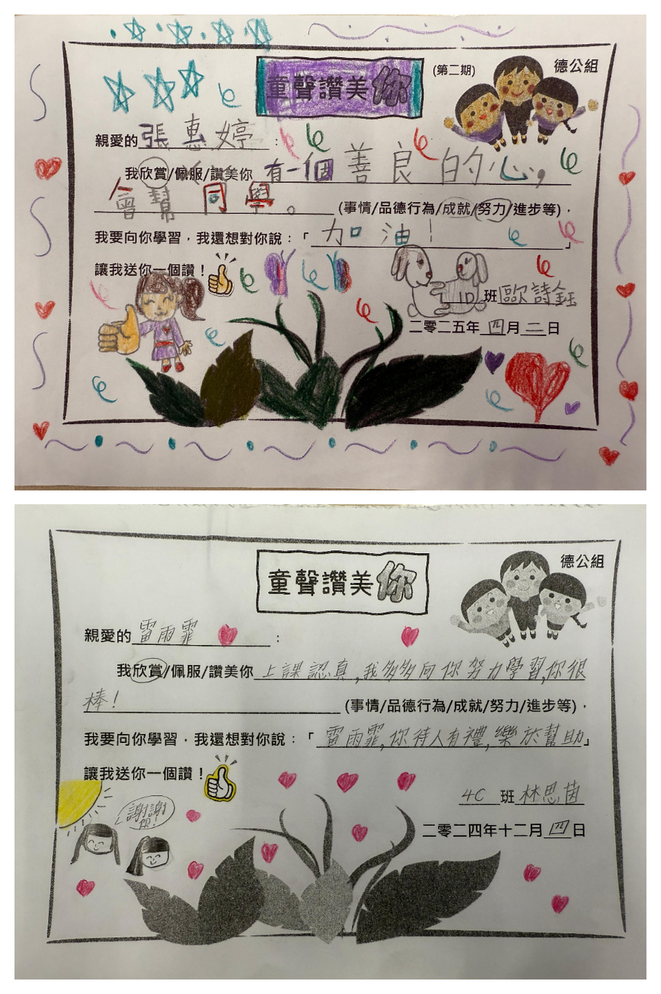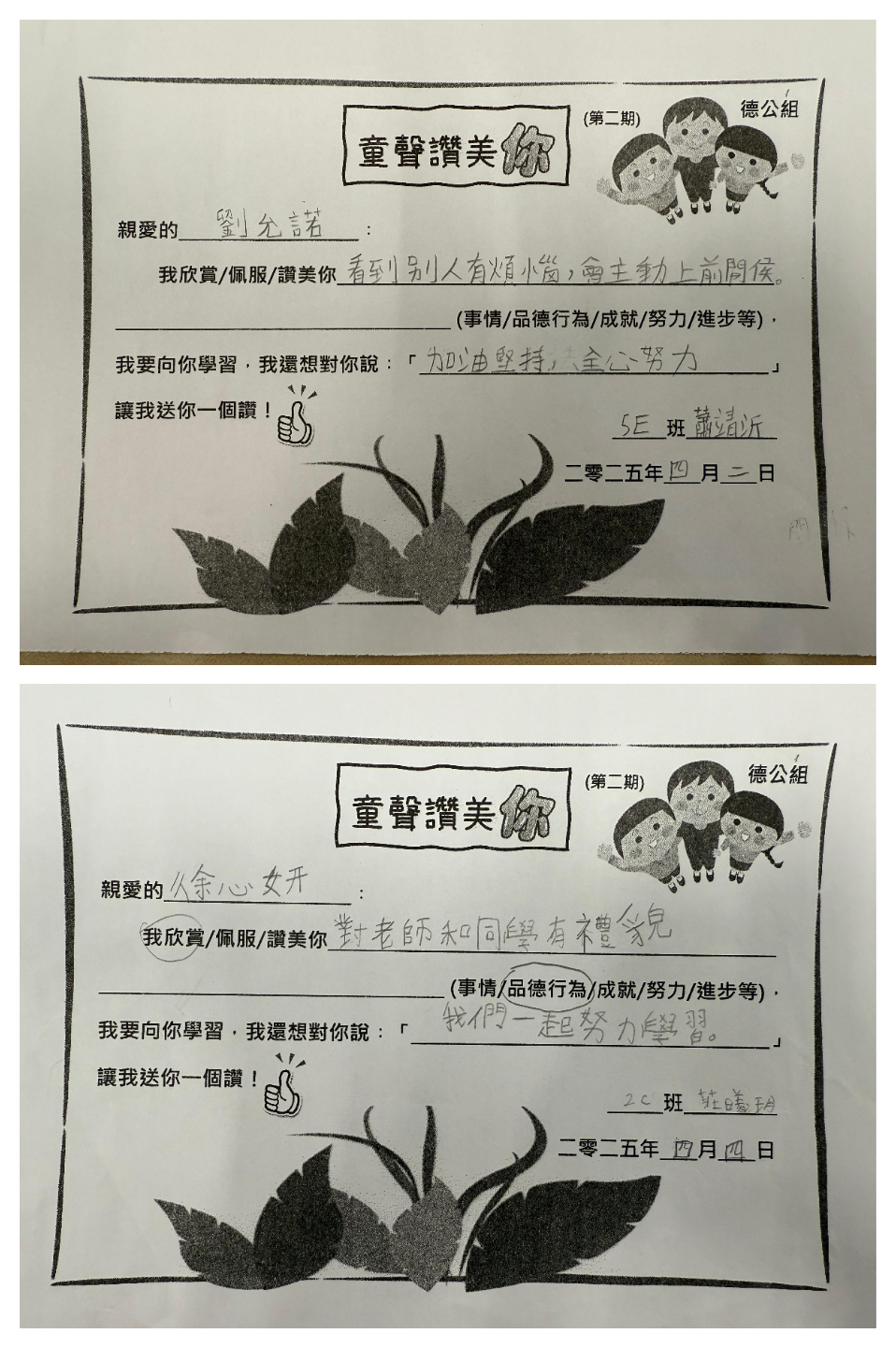 透過兩期的「一日一讚」活動,包括學生完成讚賞挑戰卡,短片欣賞以及優秀作品欣賞,學生能學習欣賞自己和他人,並能以適當的方式表達讚賞,提升學生的自我肯定和人際溝通能力。同時,學生能理解讚賞的重要性,學習並運用正向語言,營造積極向上、和諧友愛的校園氛圍。
