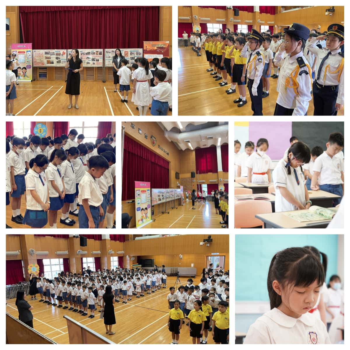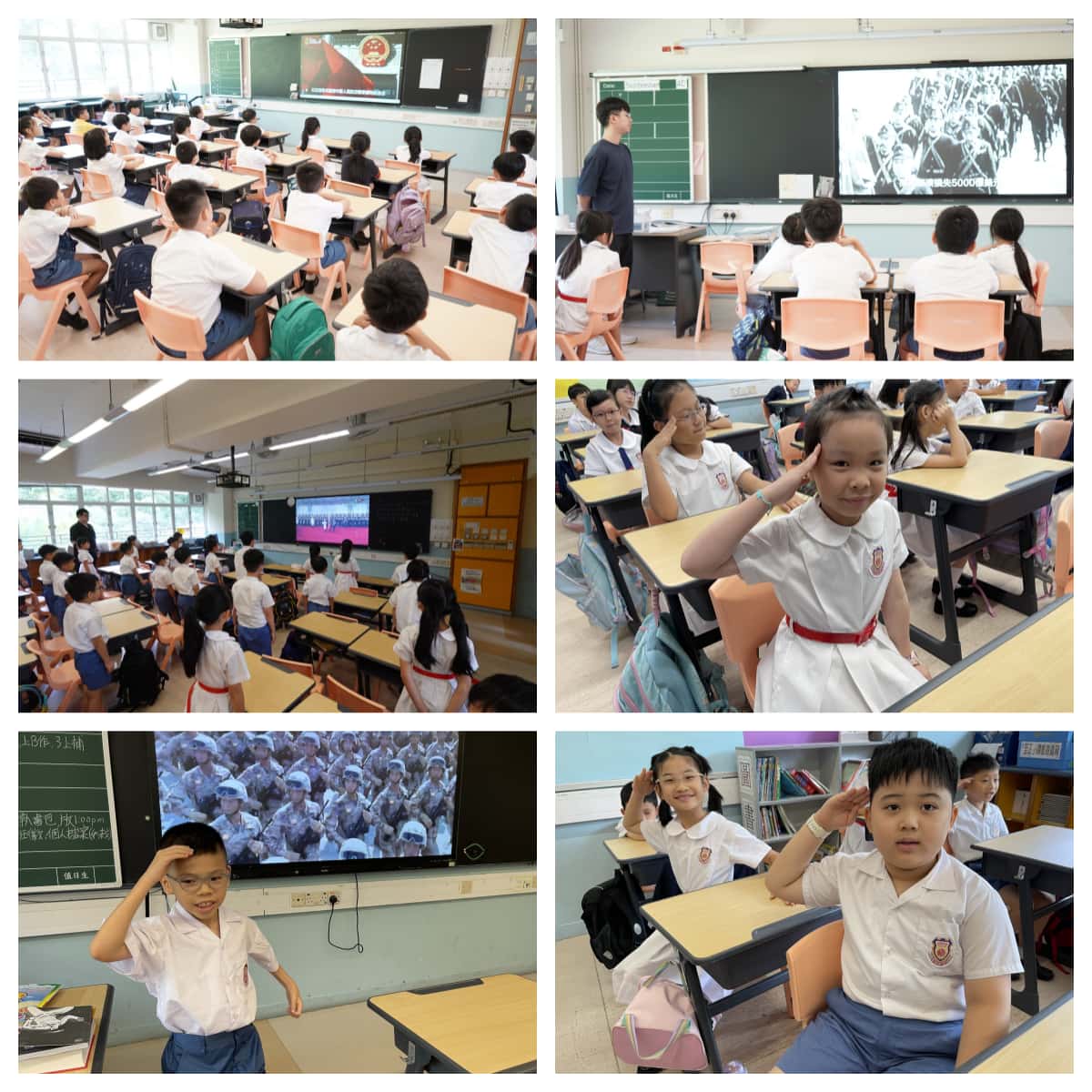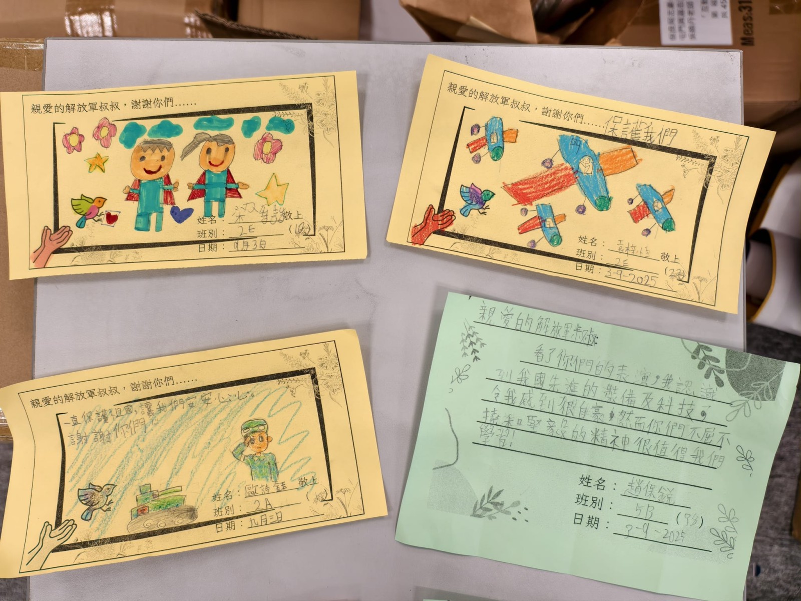 課間時段,各班播放抗戰勝利紀錄片及《保衛黃河》影片,並實時觀看閱兵儀式直播,引導學生認識國家發展、培養國民身份認同與堅毅精神。其後,學生透過「我的心意卡」活動,以文字和圖畫表達對國家與英雄的敬意與感謝,展現深厚的愛國情懷與責任擔當。