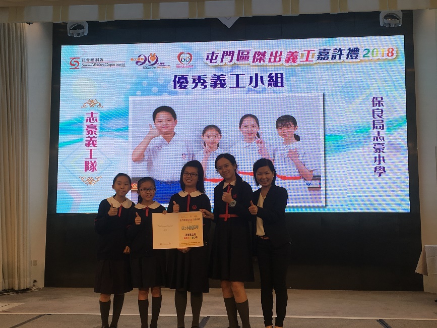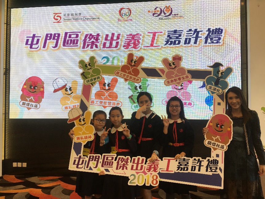 本校學生一向積極參與義工服務,表現優良,於2017-18年度參加由屯門區推廣義工服務地區協調委員會舉辦之「屯門區義工嘉許計劃2018」,獲得「屯門區義工小組優秀獎」。6A陳恩彤、6D黃籽晴、6D劉芷澄及6D蔡芷翹於24-11-2018代表本校參加「屯門區傑出義工嘉許禮2018」及領取獎狀。