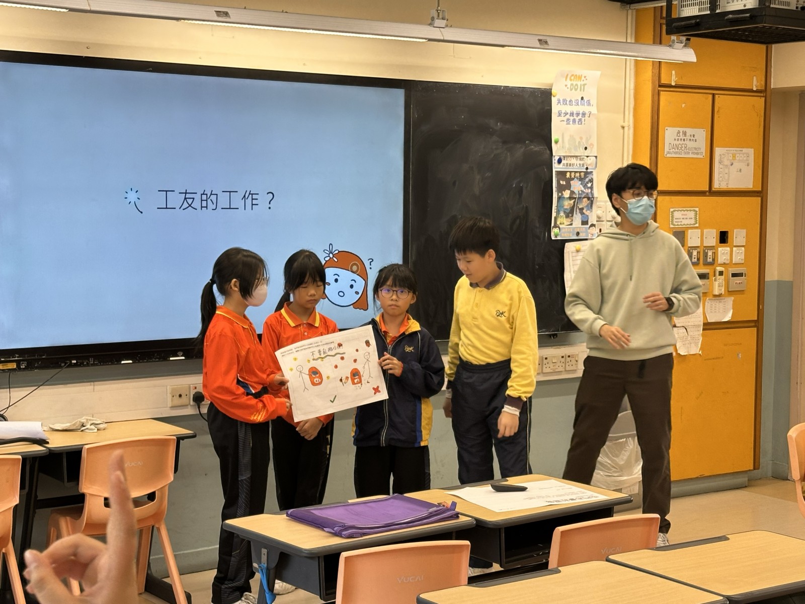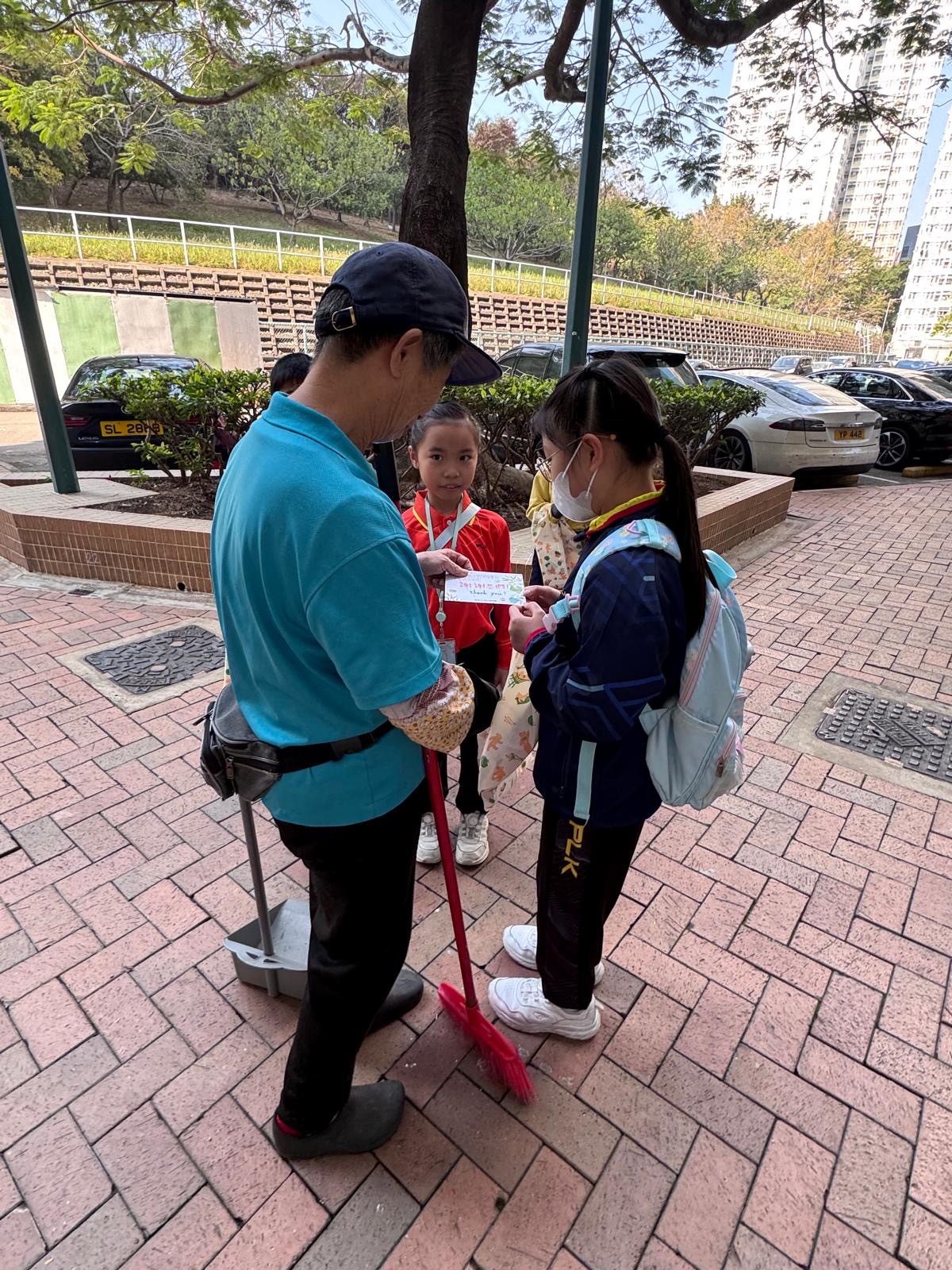 本校30名小四至小六的學生香港賽馬會慈善信託基金策劃及捐助,香港小童群益會、香港明愛及香港青年協會共同推行的「賽馬會眾心行善—義工推廣校園夥伴計劃」。學生先透過課堂活動了解社會基層人士生活,再親身到屯門社區關心清潔工友,送上小禮物,令他們可以更懂感恩、知足,獲益良多。