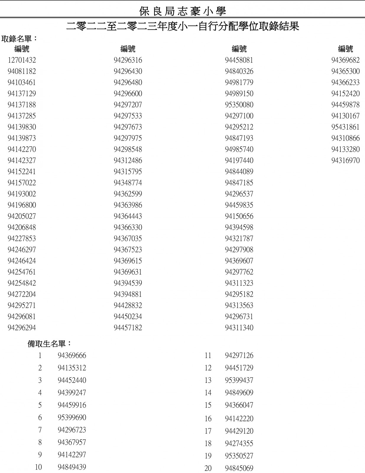 2022至2023年度小一自行分配學位取錄結果