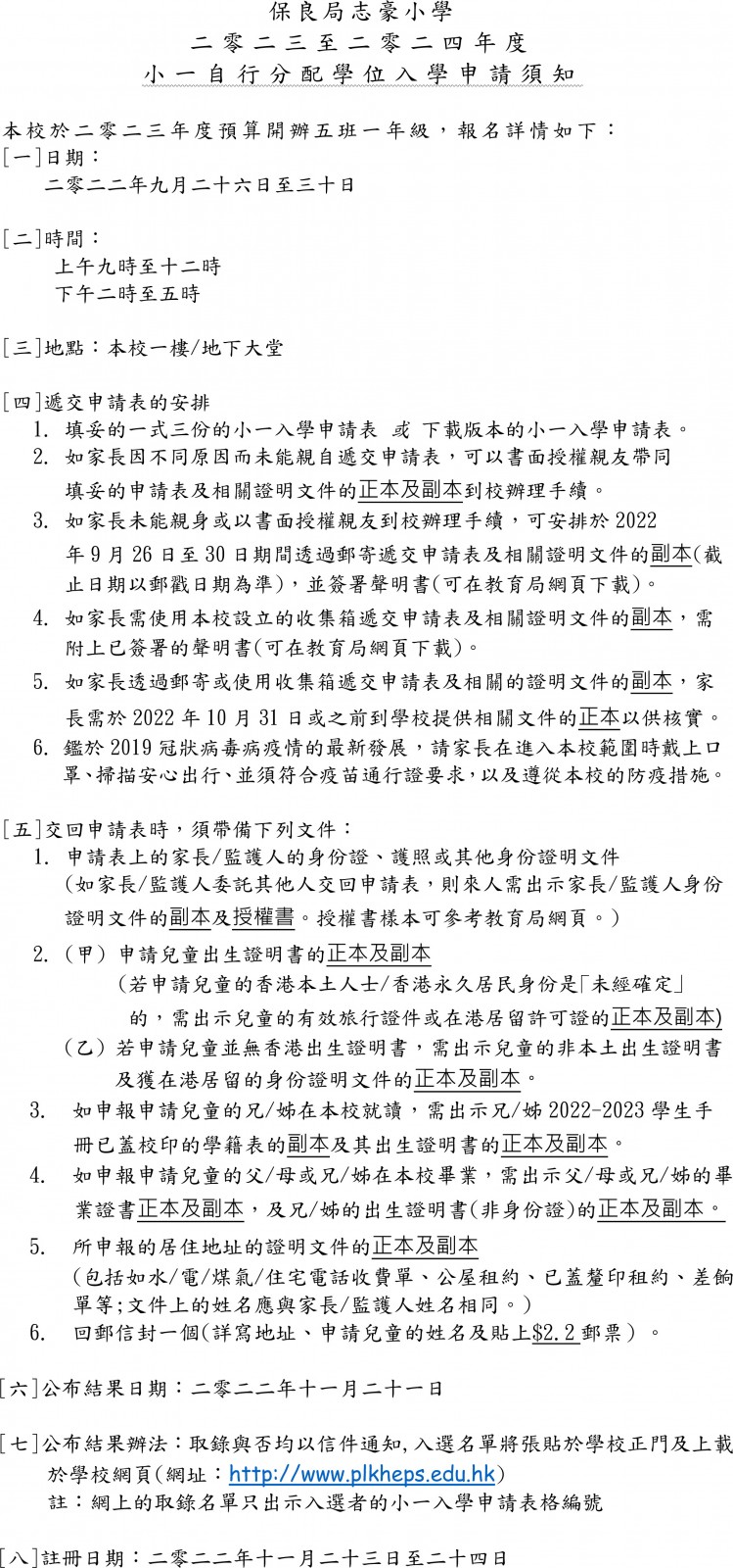 22-23年度: 【二零二三至二零二四年度 小一自行分配學位入學申請須知 】
