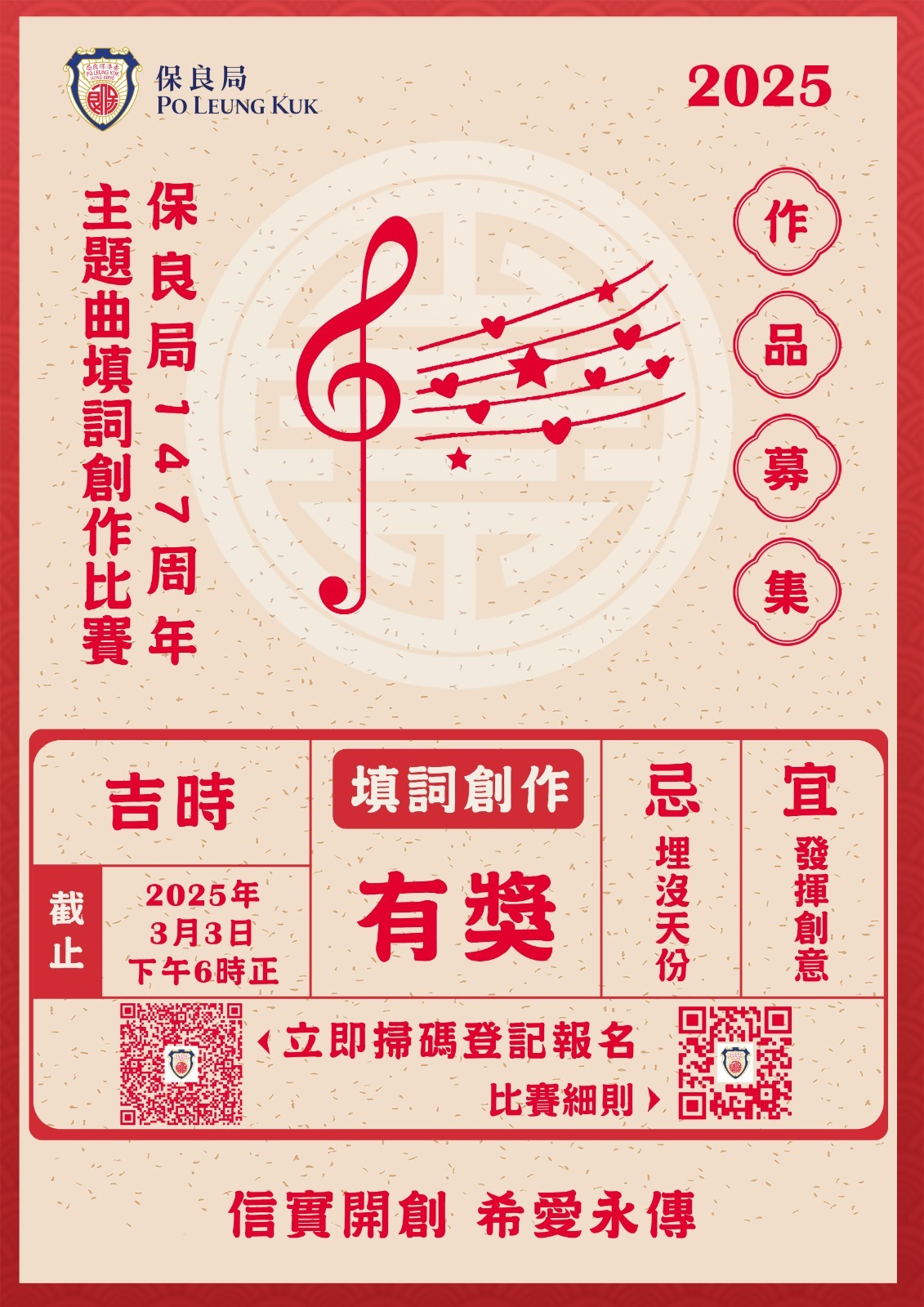 「信實開創,希愛永傳」:表達保良局服務「創新」及「傳承」的精神;在這機遇處處、多姿多彩的時代,保良局堅守初心,傳承歷年的善德與睿智,同時積極創新,帶領服務受眾攜手前行,為未來播下希望和愛的種子。歌詞內容須圍繞主題「信實開創,希愛永傳」並包括以下正面訊息: