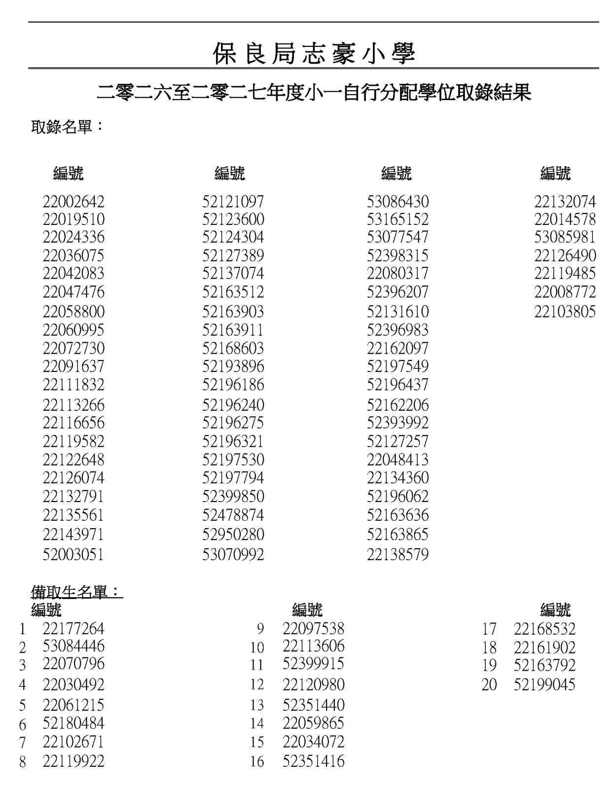 二零二六至二零二七年度小一自行分配學位取錄結果
