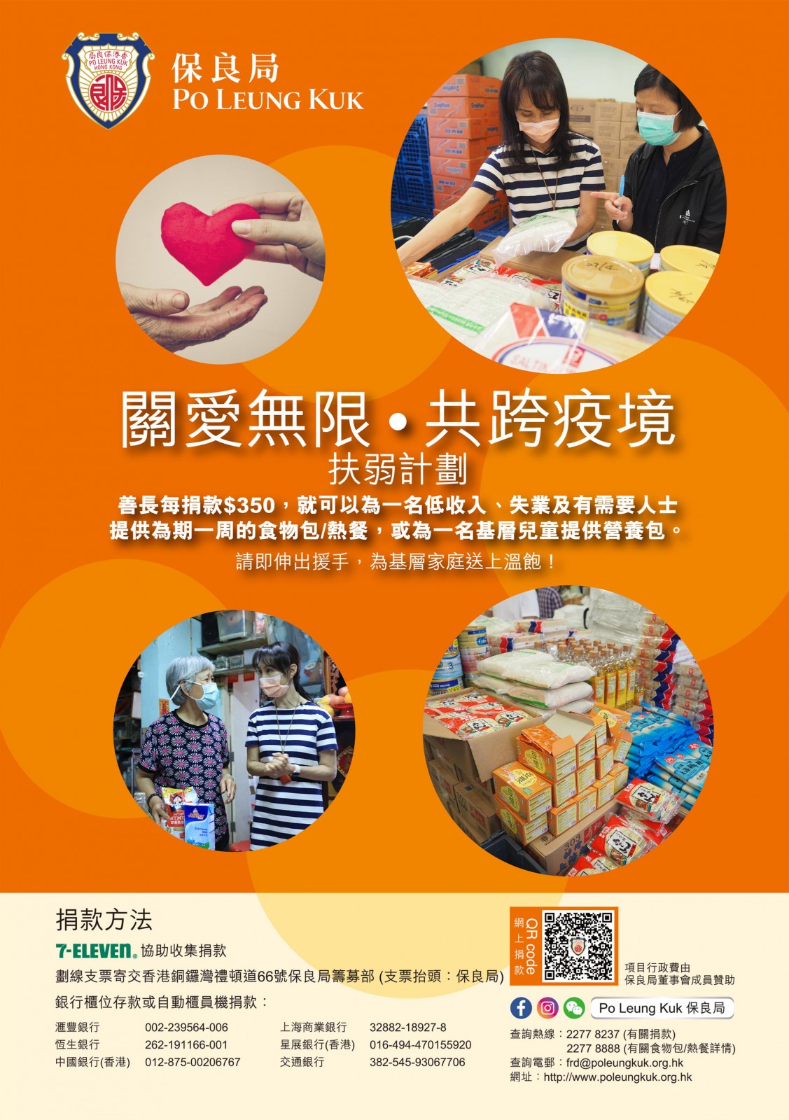 新型冠狀病毒疫情持續半年,對香港的經濟造成嚴重打擊。不少弱勢及基層社群面臨開工不足或失業問題,經濟負擔沉重,甚至難以應付日常食物開支。保良局邀請您在這關鍵時刻伸出援手,支持保良局「關愛無限 ‧ 共跨疫境」扶弱計劃,為受影響的基層家庭,尤其是小朋友送上及時雨。