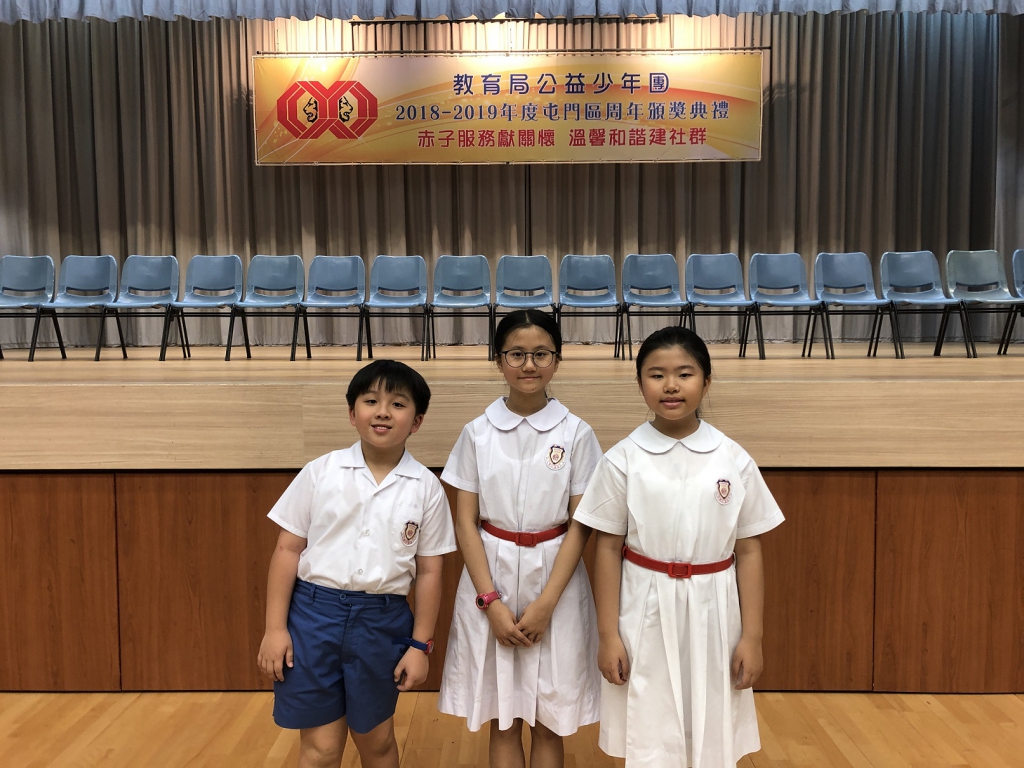 2018-19年度屯門區周年頒獎典禮於二零一九年五月二十日下午舉行,是次頒獎典禮對一眾熱心參與公益的學生加以表揚。得獎學生分別為4A何祉穎、3A方峻泓、6D陳嘉怡。當天的花絮如下: