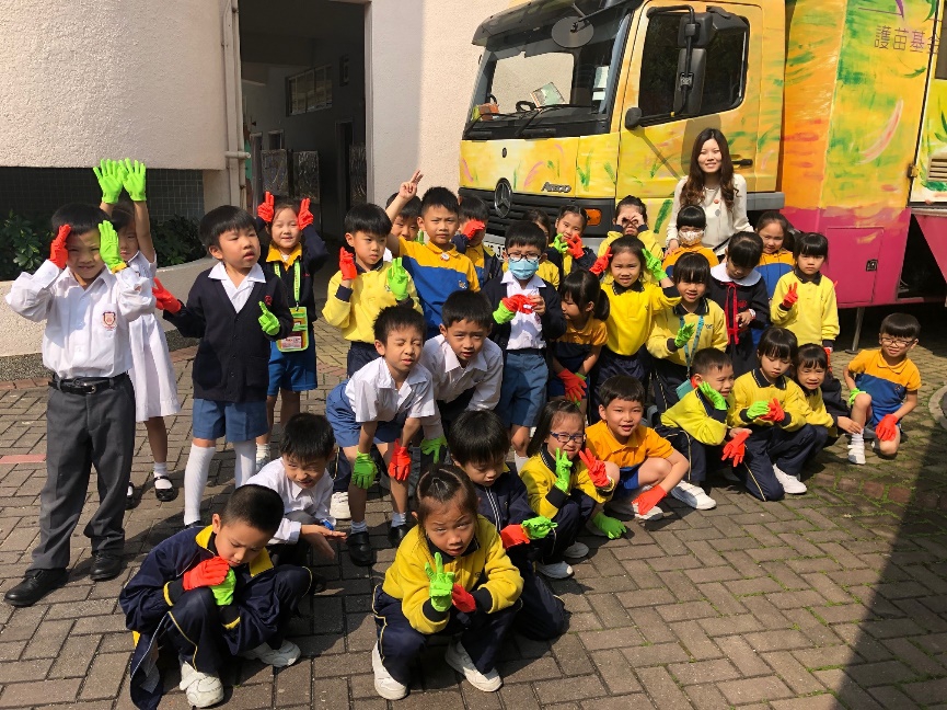 活動完結後,每位同學都有一雙不同顏色的螢光手套及精美禮物,跟班主任在護苗車前拍一張大合照留念。